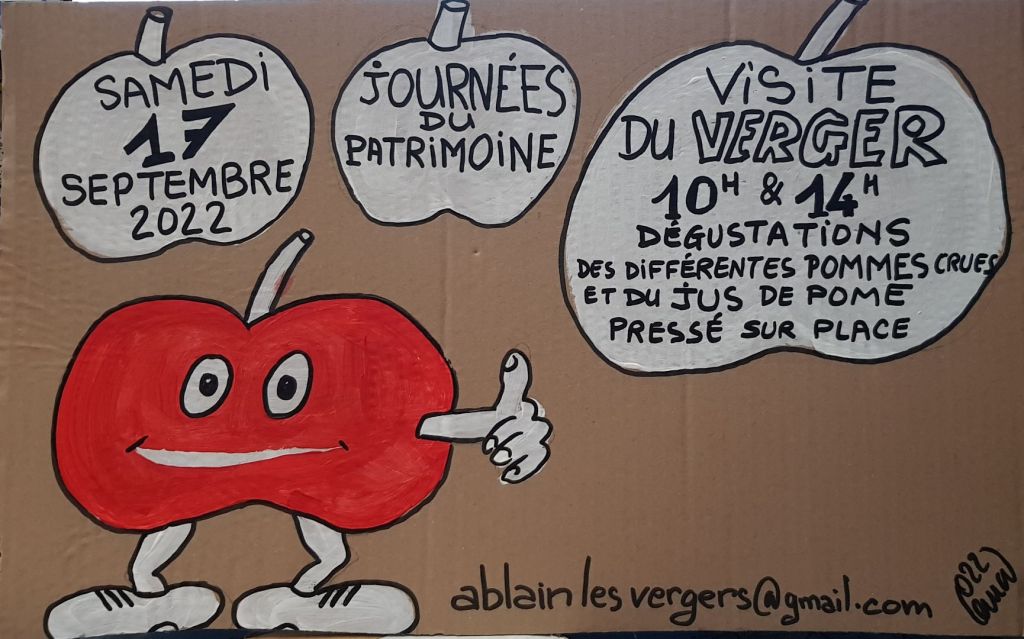 Samedi 17 à 10h et 14h visite du Verger avec dégustation des différentes pommes crues et du jus de pomme pressé sur place par Les Amis du Verger