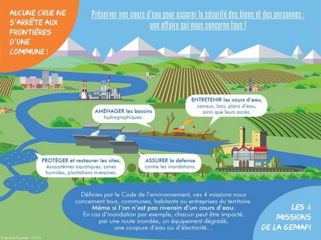 Mais c’est quoi la GEMAPI ? GEMAPI veut dire « Gestion des milieux aquatiques et prévention des inondations ». Elle comprend selon le code de l’environnement (article L211-7 du code de l’environnement ), 4 parties obligatoires :