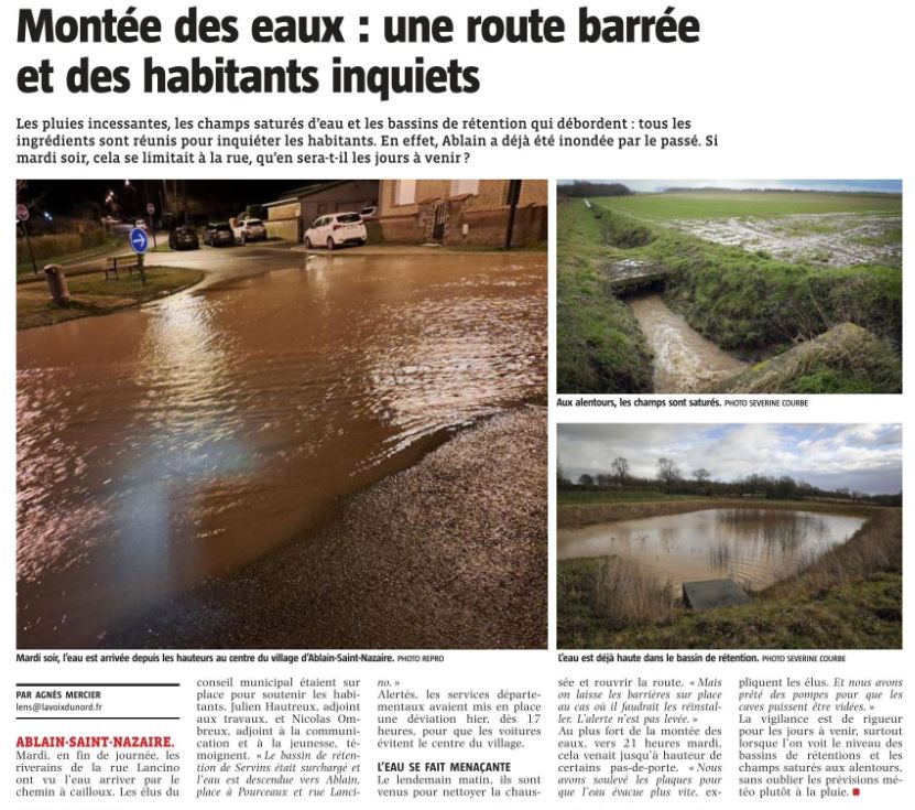 Non classé Montée des eaux autour d’Ablain-Saint-Nazaire, une route barrée et des habitants inquiets (Article La Voix du Nord) Date: 4 janvier 2024Author: comablain 0 Commentaires Partager : Cliquer pour imprimer(ouvre dans une nouvelle fenêtre) Imprimer J’aime chargement… Similaire