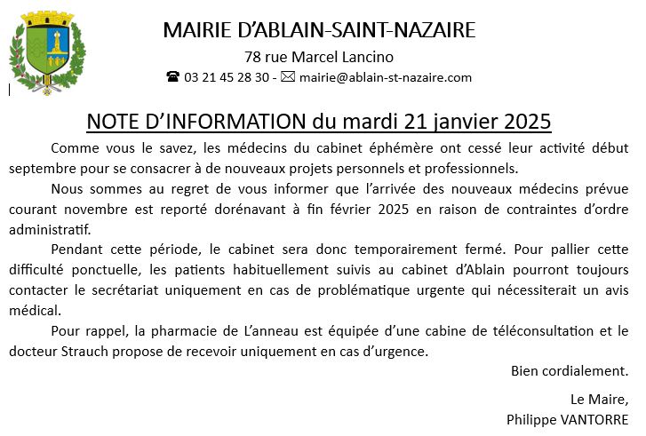 Non classé Information Cabinet Médical Date: 23 janvier 2025Author: comablain 0 Commentaires Partager : Imprimer(ouvre dans une nouvelle fenêtre) Imprimer J’aime chargement… Similaire