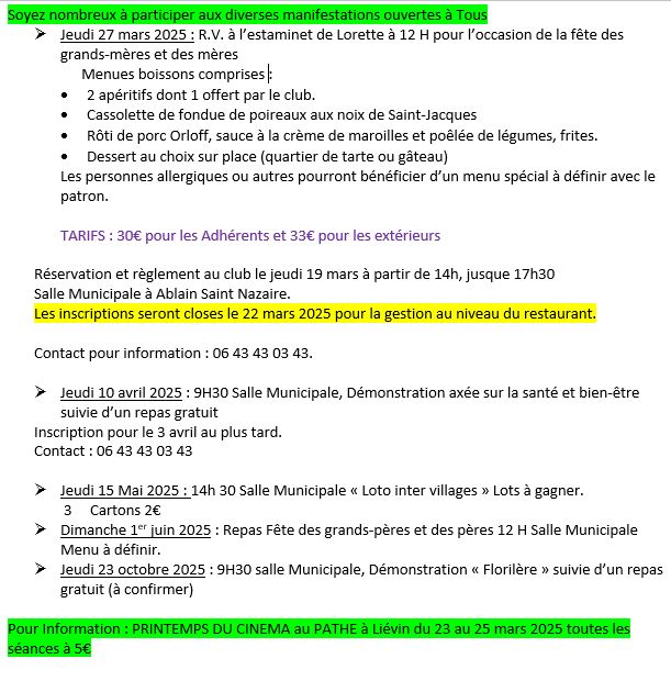 Non classé Le club de l’Amitié d’Ablain Saint Nazaire vous propose Date: 19 mars 2025Author: comablain 0 Commentaires Partager : Cliquer pour imprimer(ouvre dans une nouvelle fenêtre) Imprimer J’aime chargement… Similaire