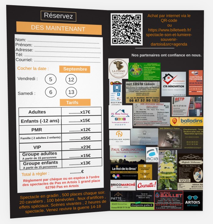 Renseignement possible par téléphone au 06-50-64-72-78 , réservation à la mairie de Pas en Artois ou via notre billetterie billet web , joint au courrier .